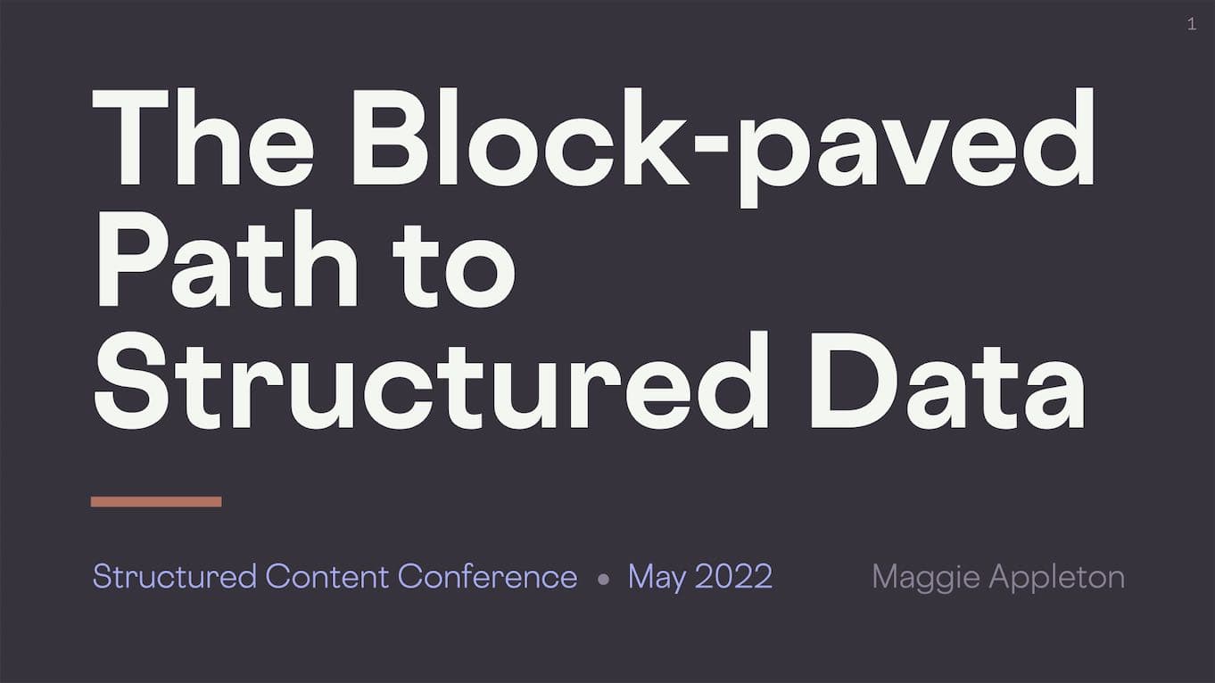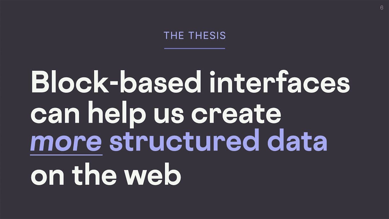 I like to give the punchline away early in my talks. I'm here to convince you of a thesis – that block-based interfaces can help us create more structured data on the web.