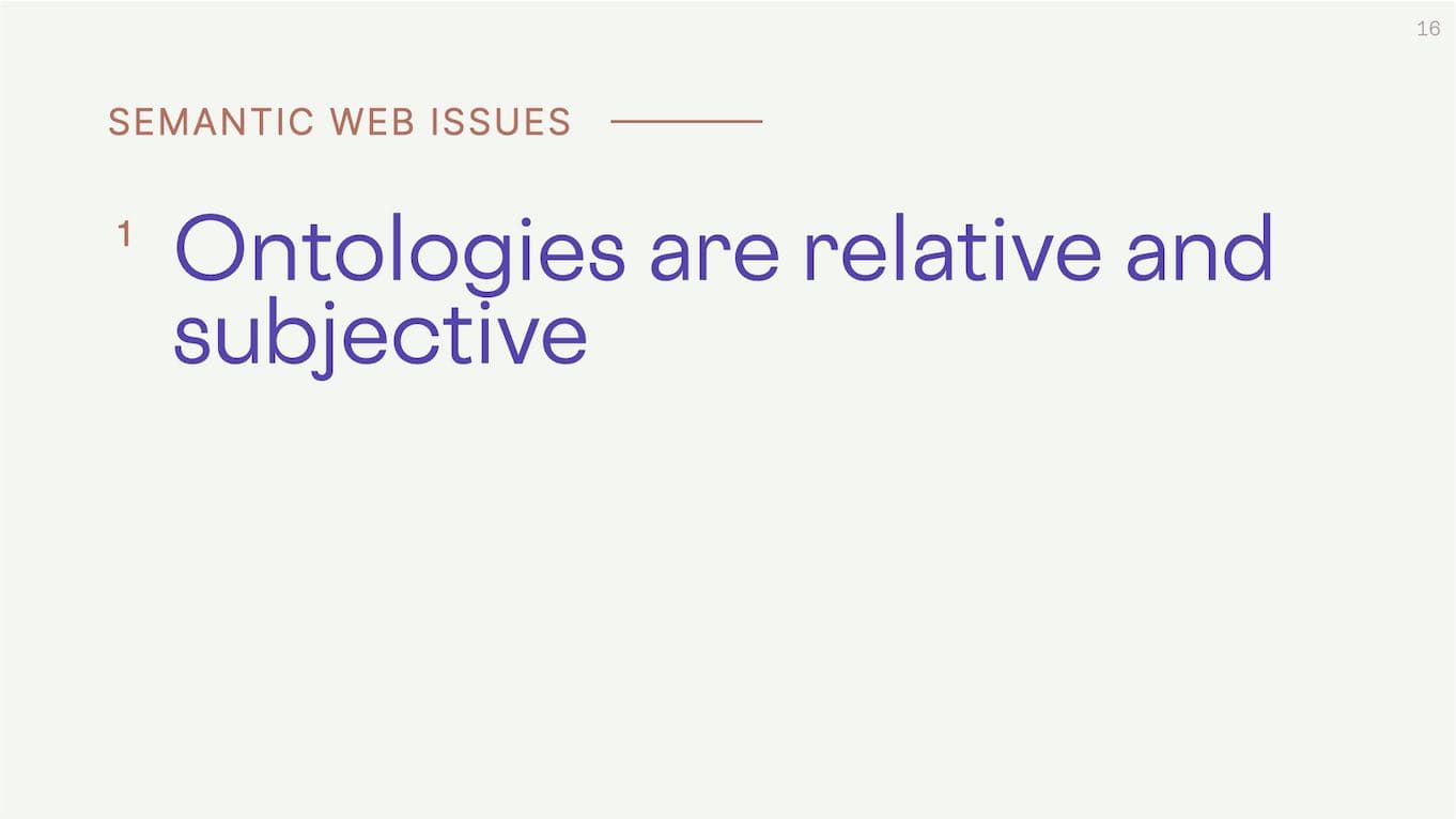 First, ontologies – meaning the schemas we define for types like “Person” or “Book” – are always culturally relative and subjective. There is no universal single set of properties we can all agree upon. This is because human culture is inherently pluralistic. That's perhaps the whole point of human culture. It's a mechanism to create wildly diverse ways of seeing and being in the world. So diverse it makes it impossible to agree on fundamental categories and properties for what exists around us.
