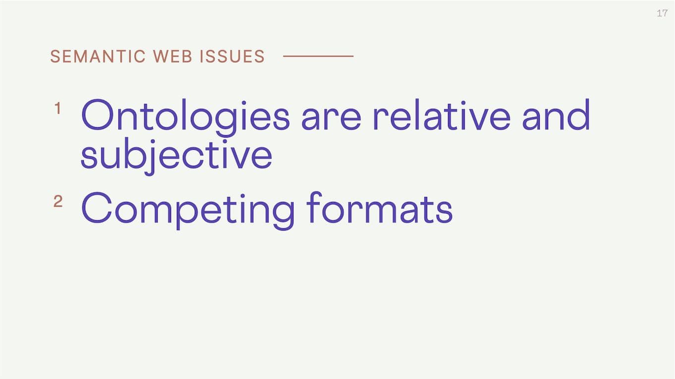 The second issue is competing formats. Over the years people have proposed many different ways to implement structured data on the web. There's RDF and RDFa, JSON-LD, and Microformats