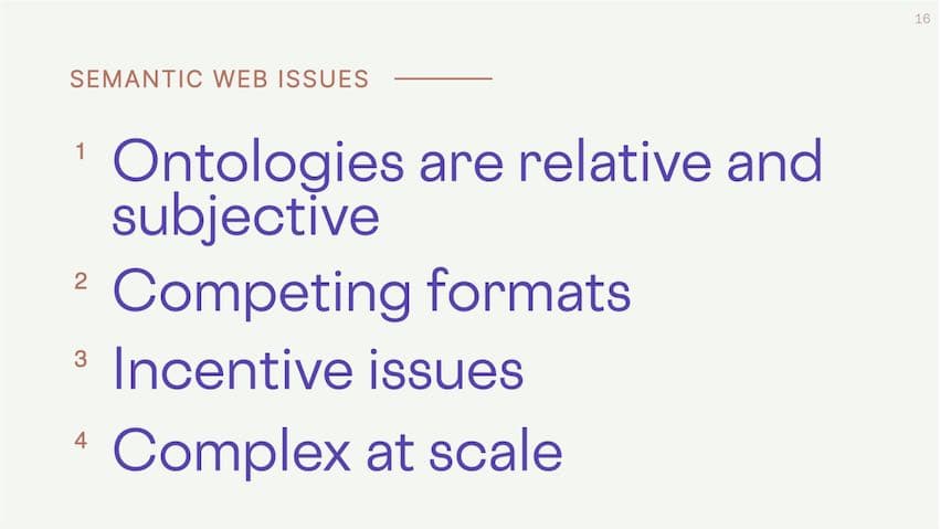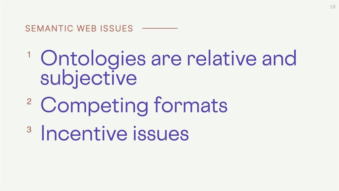 Lastly, the ambitious scale of the semantic web compounds all the above problems. Trying to structure data across the entire web leads to issues of complexity.