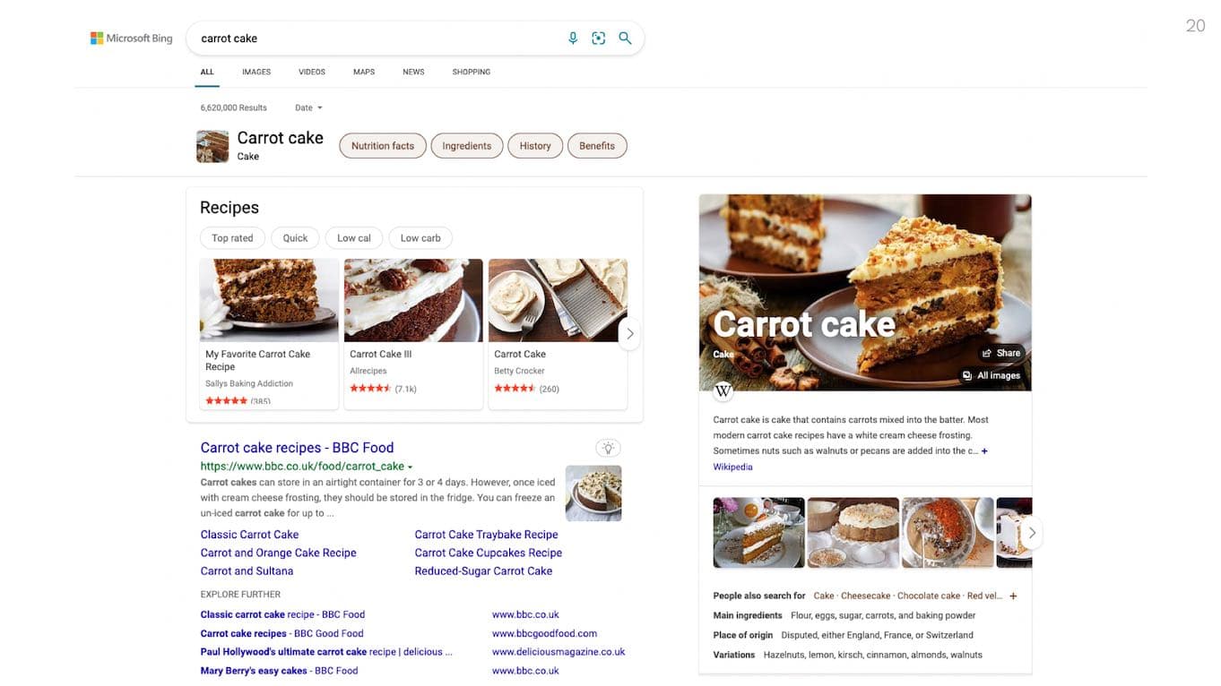 If I search for a recipe like “carrot cake” on the search engine Bing, I get a page filled with useful information like images, ratings, keywords, and Wikipedia data. All without needing to navigate to individual results pages. This is a much better experience than seeing a wall of text.