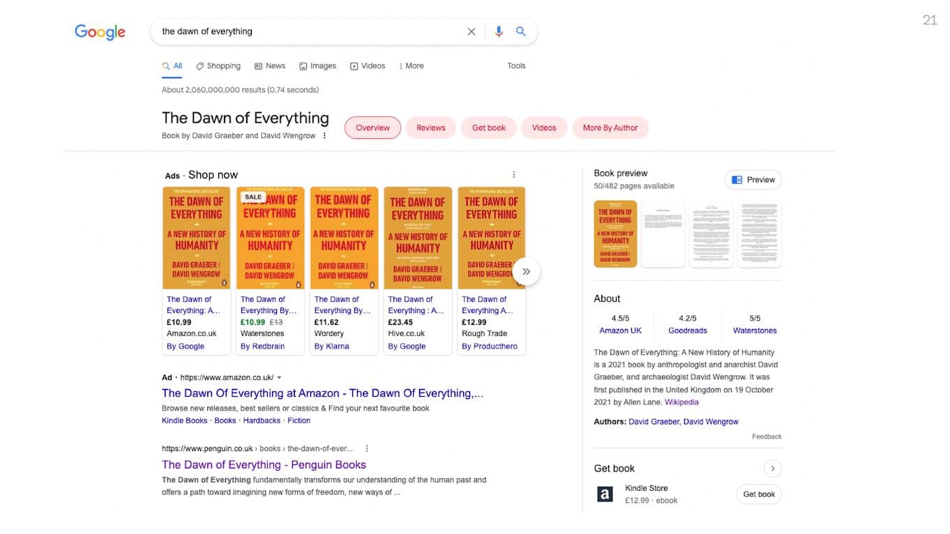 Similarly, if I search for the book “The Dawn of Everything” on Google, I get page showing me key information about the book. But I also get a row of options for where to buy this book and how much it costs.