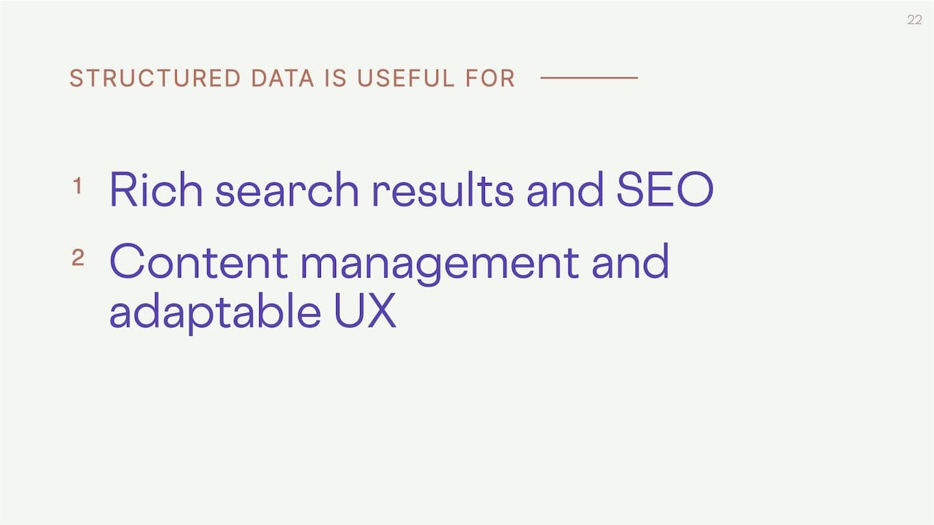 Second, structured data can help us manage content in a way that leads to adaptable, more sophisticated UX. This use case is what most of the people at this conference are focused on.
