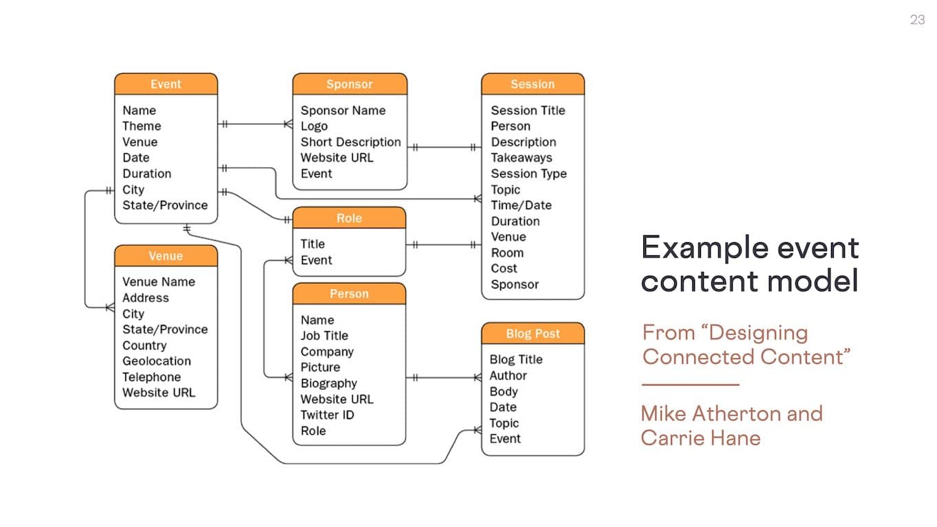 This is an example of a content model from the book Designing Connected Content. It shows a set of entities, properties, and relationships related to an Event type. This sort of structured content modelling allows us to create interfaces that provide users with a clear mental model of the things they're interacting with. It also makes it easy to define these pieces of data in one central place and flexibly reuse them across devices, platforms, and contexts.