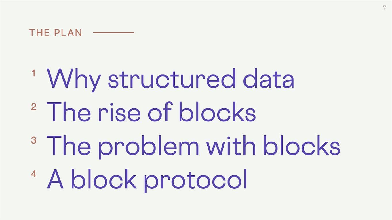 We're going to tackle this in four parts; we'll first clarify why we should care about structured data at all. We'll then look at the rise of block-based interfaces – a design pattern that's become incredibly popular over the last 5 years. We'll then consider some current problems with block-based interfaces. And finally we'll explore a protocol that we've been working on at HASH. The goal of it is to address many of these problems both with blocks and structured data.