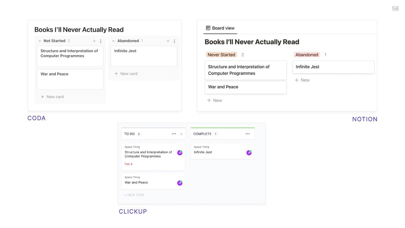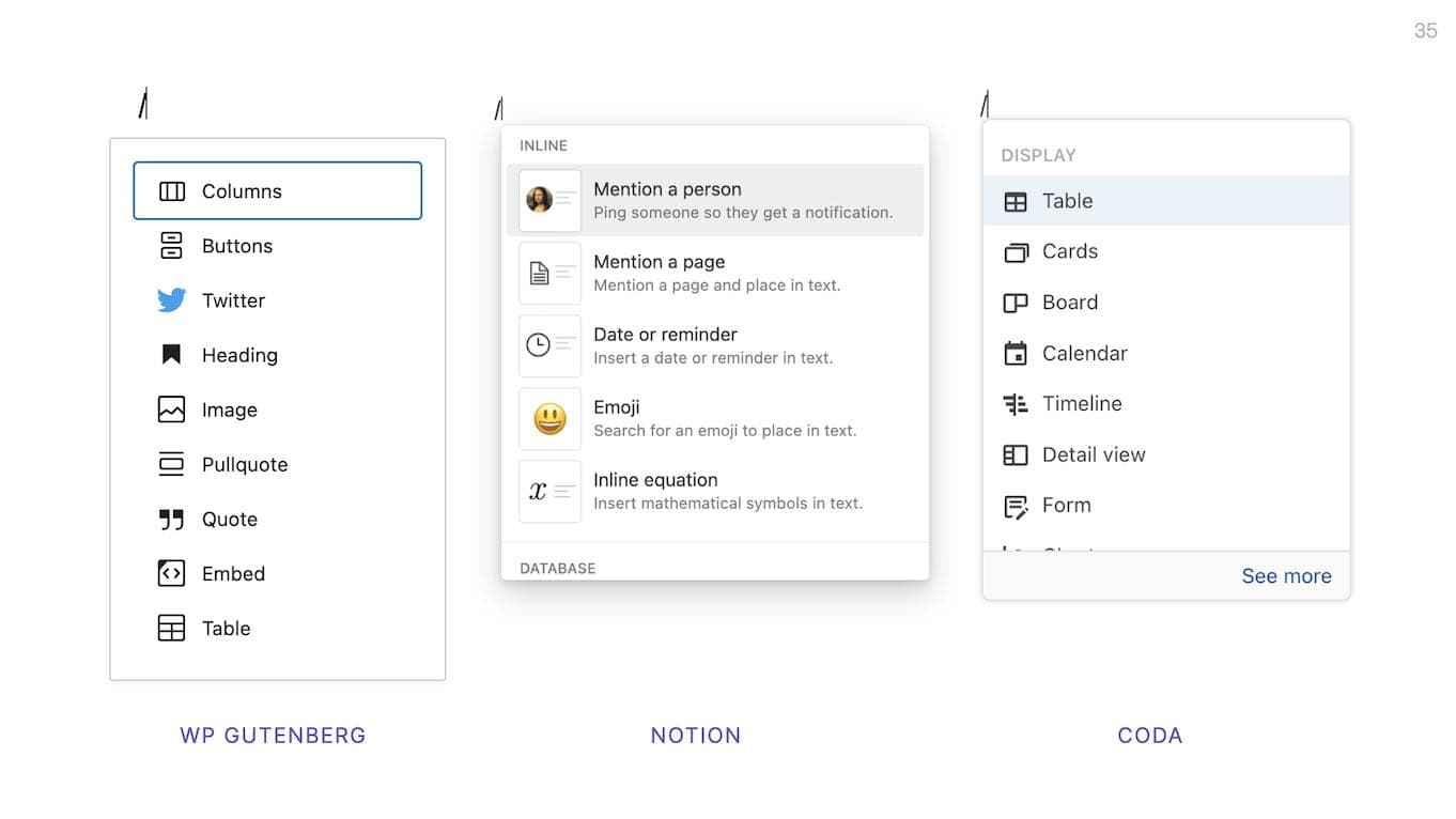 If we look at the kanban block in Notion, Coda, and ClickUp, we'll notice they all work the same. They offer the same basic functionality, format, and interactions. But the developers had to build each of these seperately. (Editor's note: take for example apps like WordPress, DayOne and Tumblr — each of these from the single same company, Automattic, each using the exact same framework, Gutenberg, and yet each today has their own 'image' block, developed separately without shared abstractions to build upon)