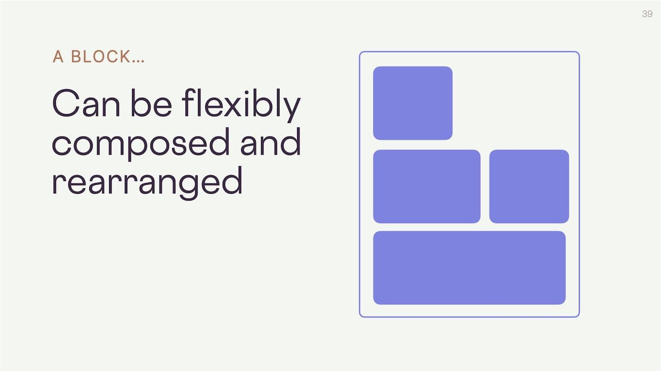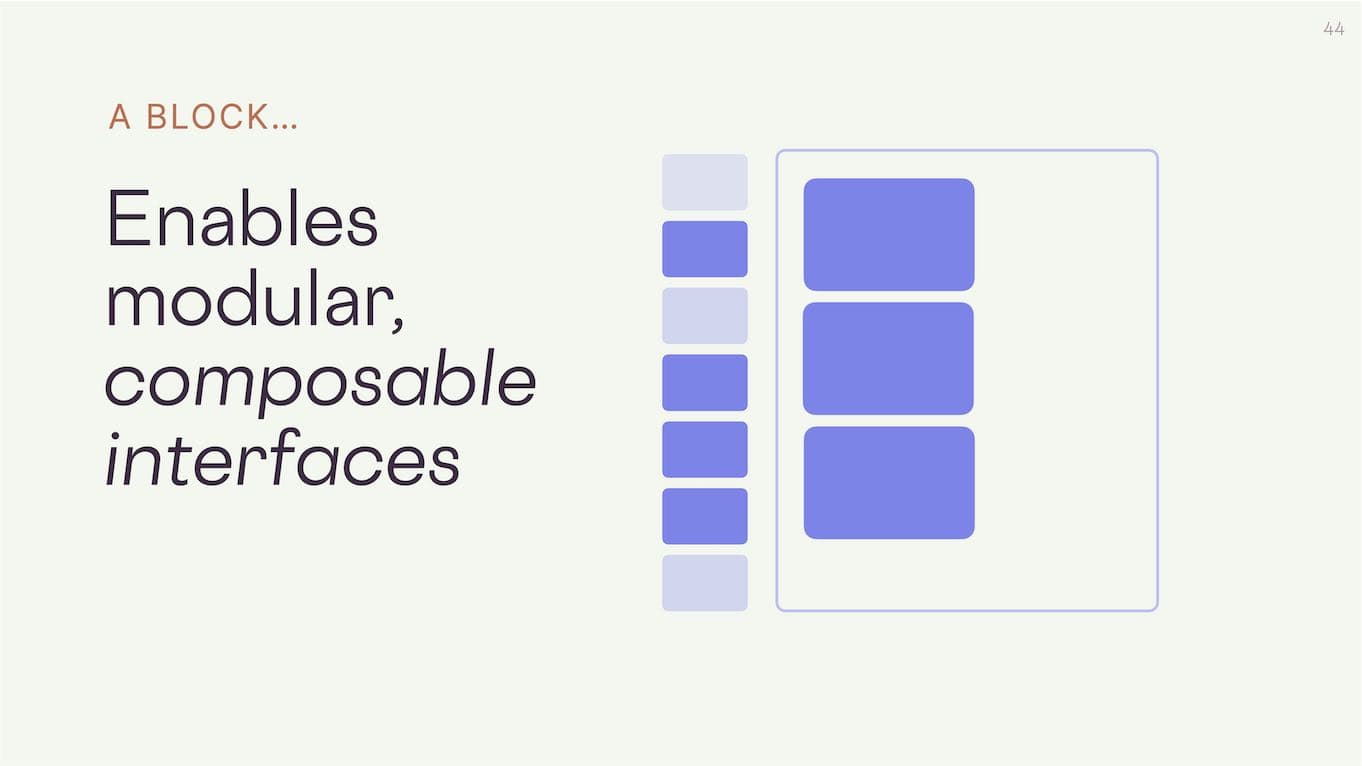Blocks also enable what I call modular, composable interfaces. Open canvases where users can drag and drop blocks into place like legos. These are easy to use and accessible to a much wider audience than any markup or syntax could hope to be.