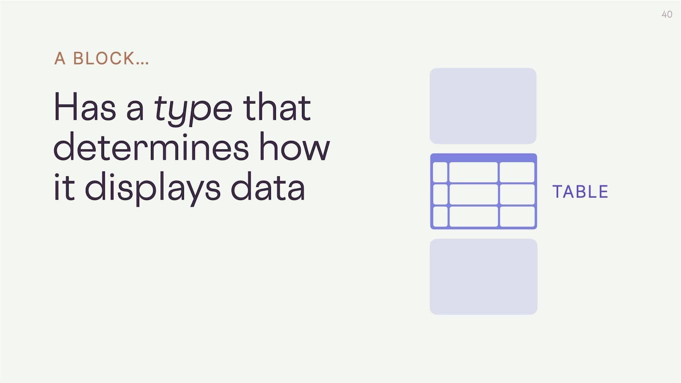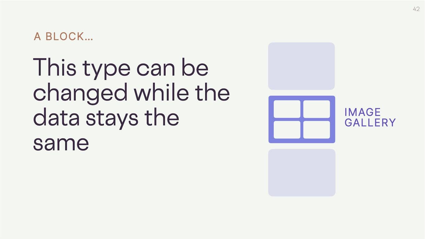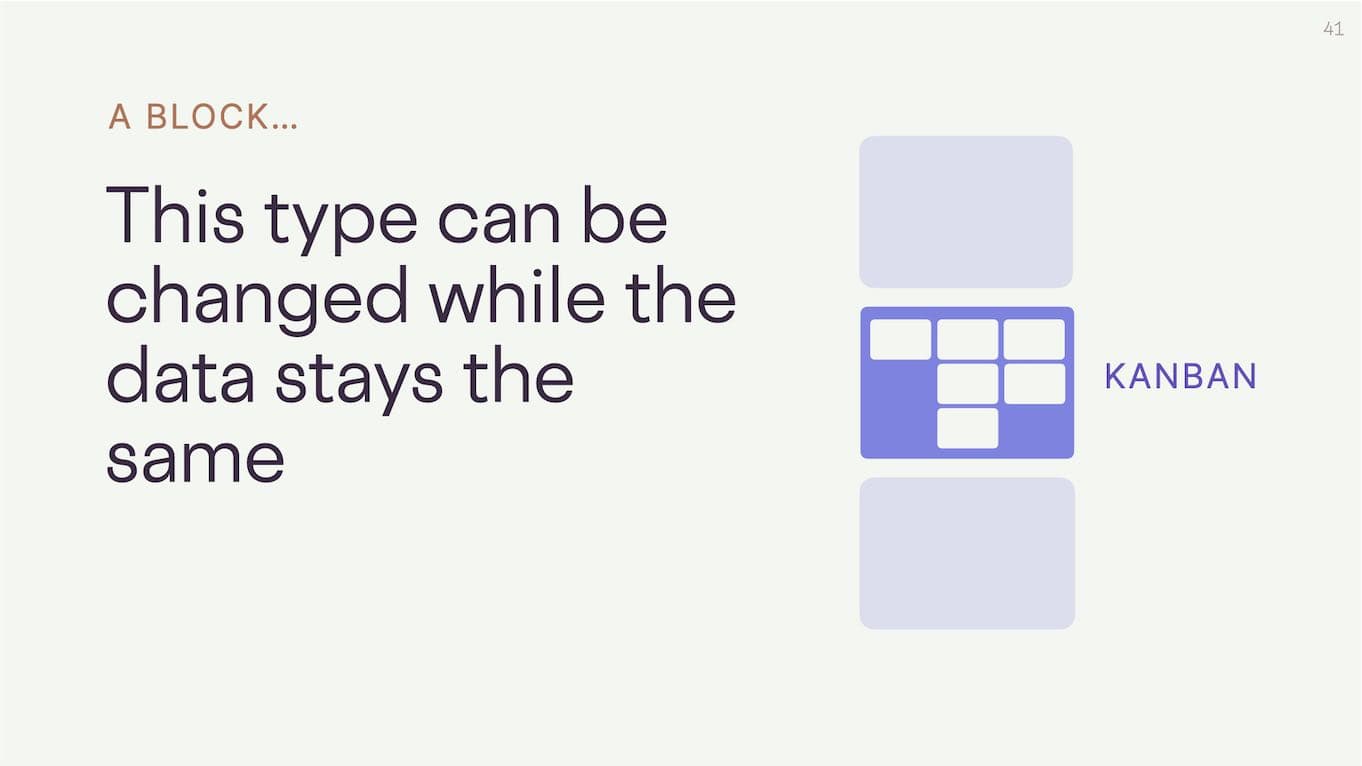 Another key feature of blocks is you can change that type while the data inside the block stays the same. This means we have a separation of the data from the view. So a set of kanban cards could become...