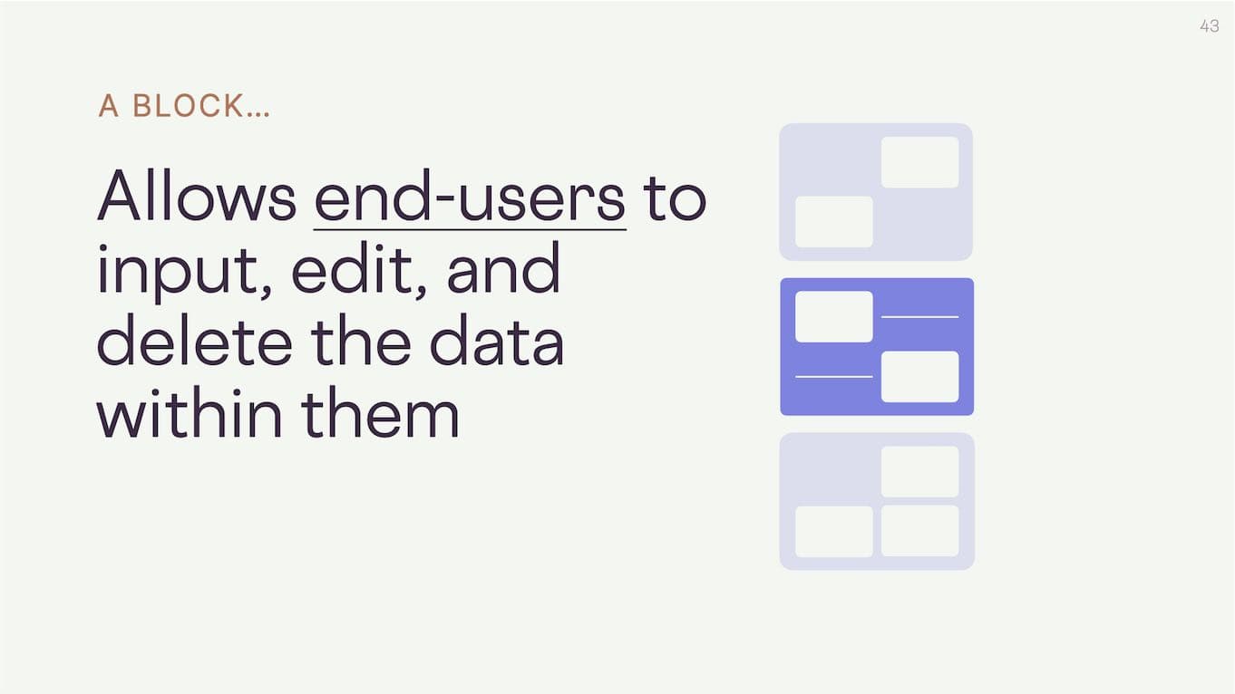 And critically, blocks allow end-users, meaning anyone who is not a professional developer, to create, edit, and delete the data within these blocks. All without writing any code. The users are in control of the data rather than the developers.