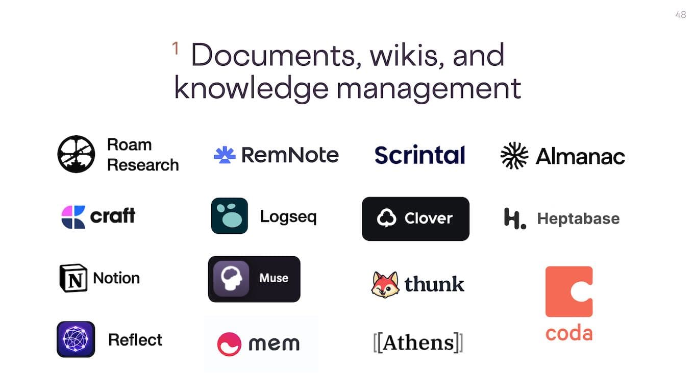 The first is documents, wikis, and knowledge management systems. The kinds of apps people use for note-taking or team communications. This is the most popular use case at the moment.