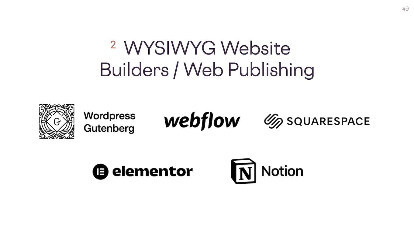 The second is WYSIWYG website builders and web publishing platforms. This includes platforms like WordPress's Gutenberg editor, Squarespace, and Webflow. They're explicitly designed to help you create standard web designs like landing pages, contact forms, and blogs.