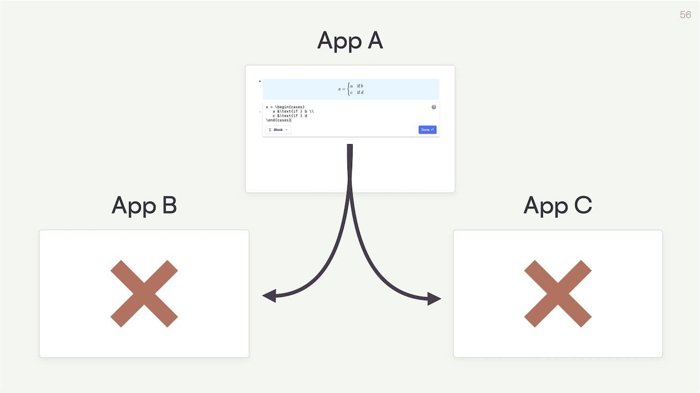 Let's say there's a block that renders LaTeX beautifully in my note-taking app. But I also want to publish LaTeX code to my website and my company wiki. But those apps don't have blocks that render LaTeX. I'm now stuck. There's no way for me to port the LaTeX block across applications.