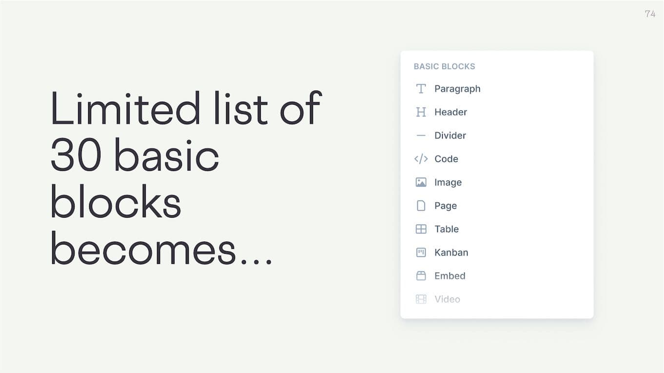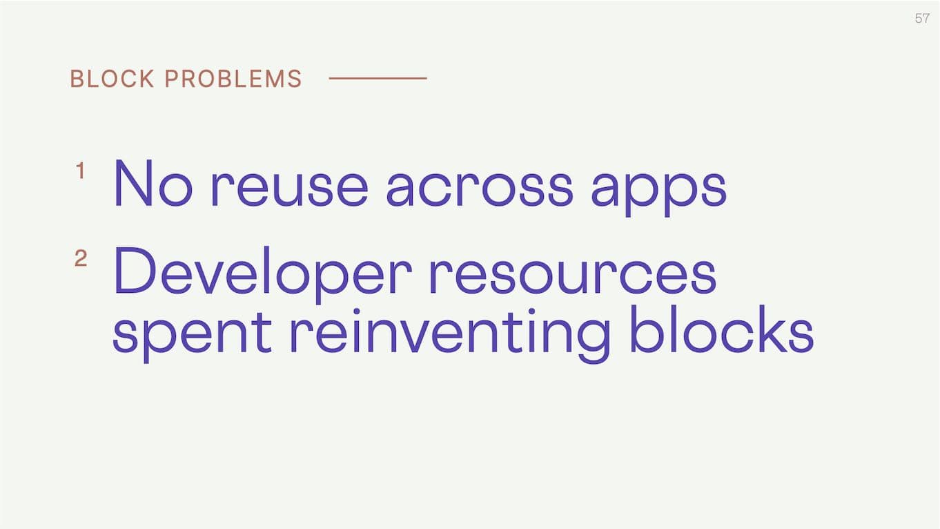 Most of these apps have the same basic types of blocks; header, checklist, table, image, embed, etc. But every team of developers has to build their own set of these.