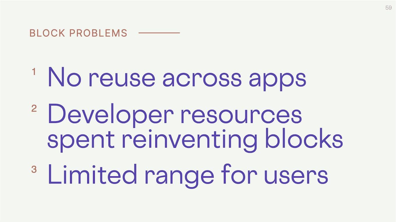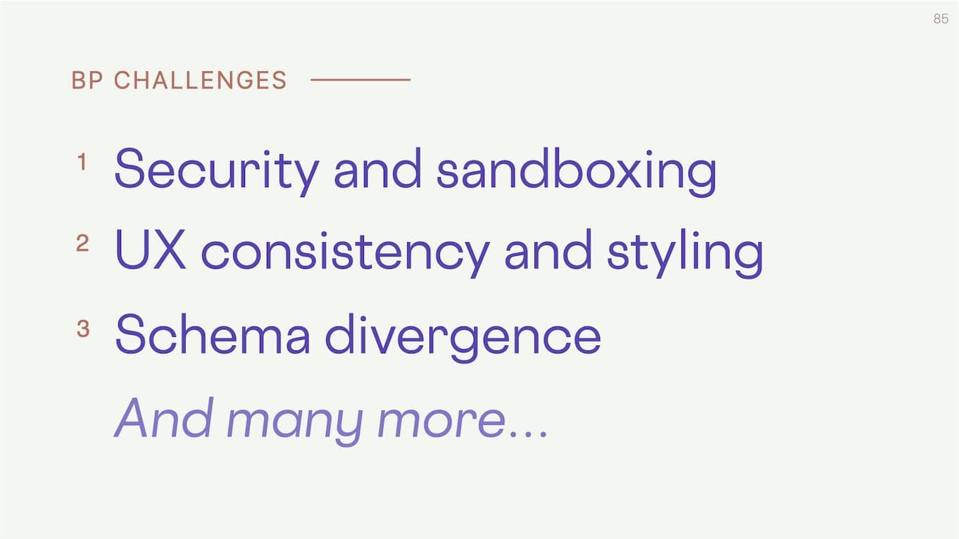 A few of the major challenges we have draft solutions for are security and sandboxing for untusted blocks, maintaining consistent UX and styling across blocks, and handling schema divergence.