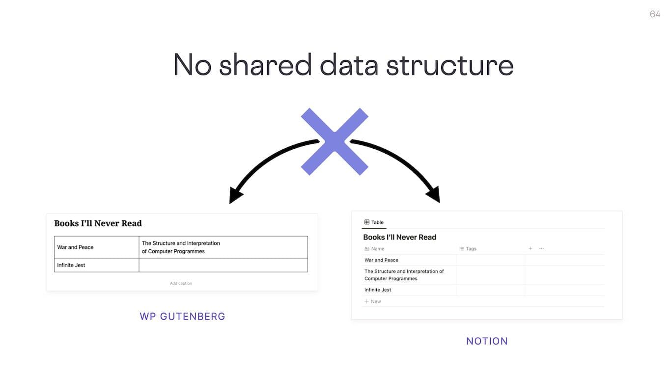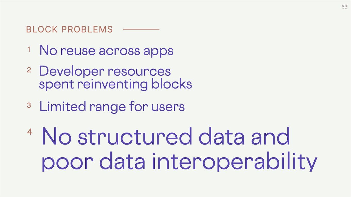The final and biggest problem with proprietary blocks is that there's no structured data behind these blocks. Which in turns leads to poor data interoperability between platforms.
