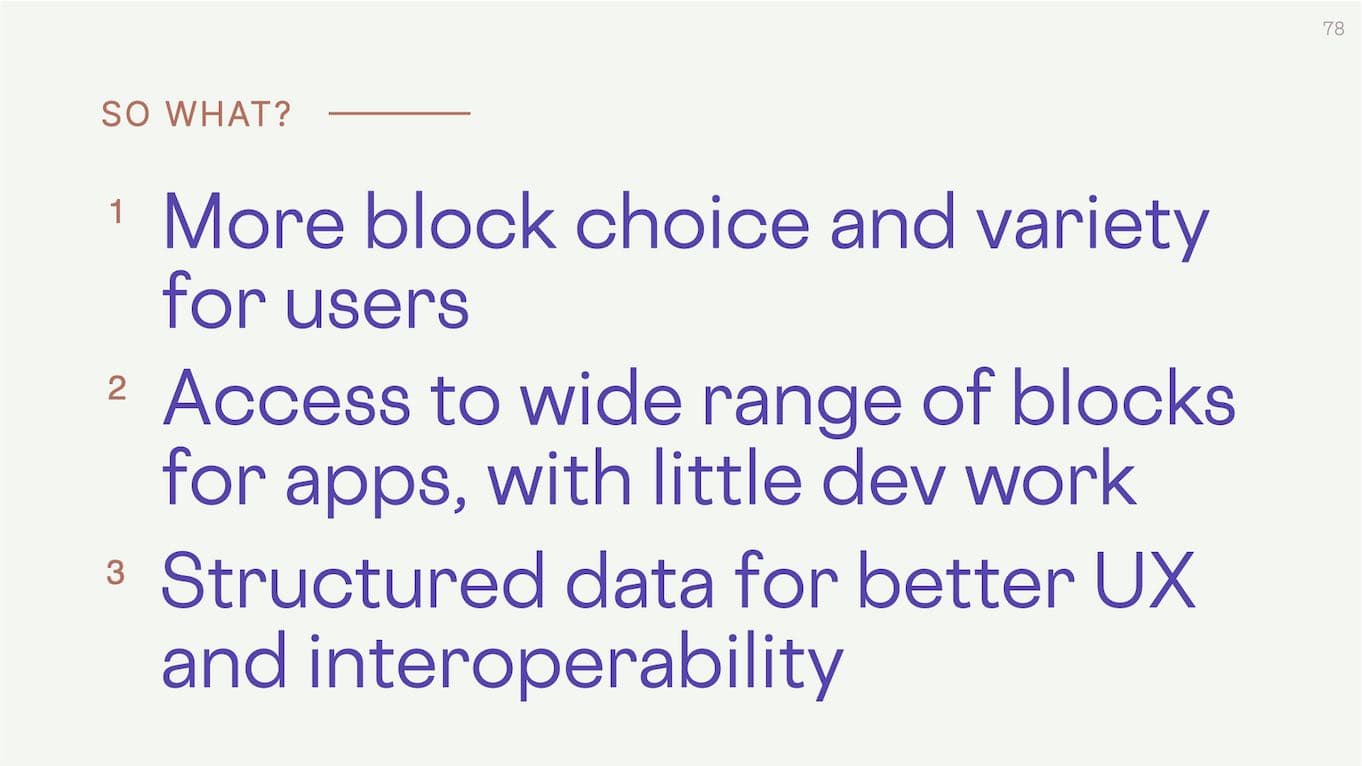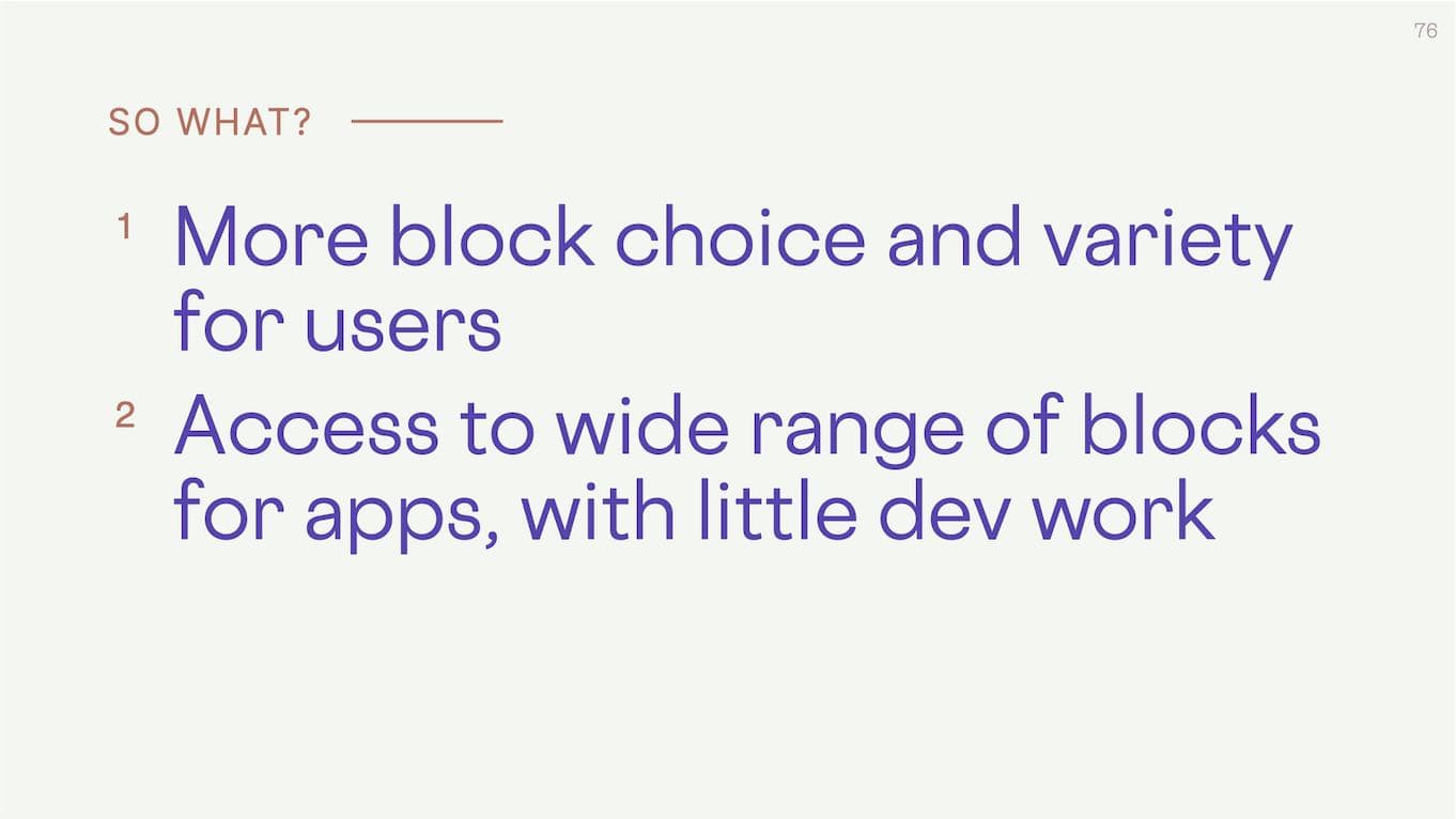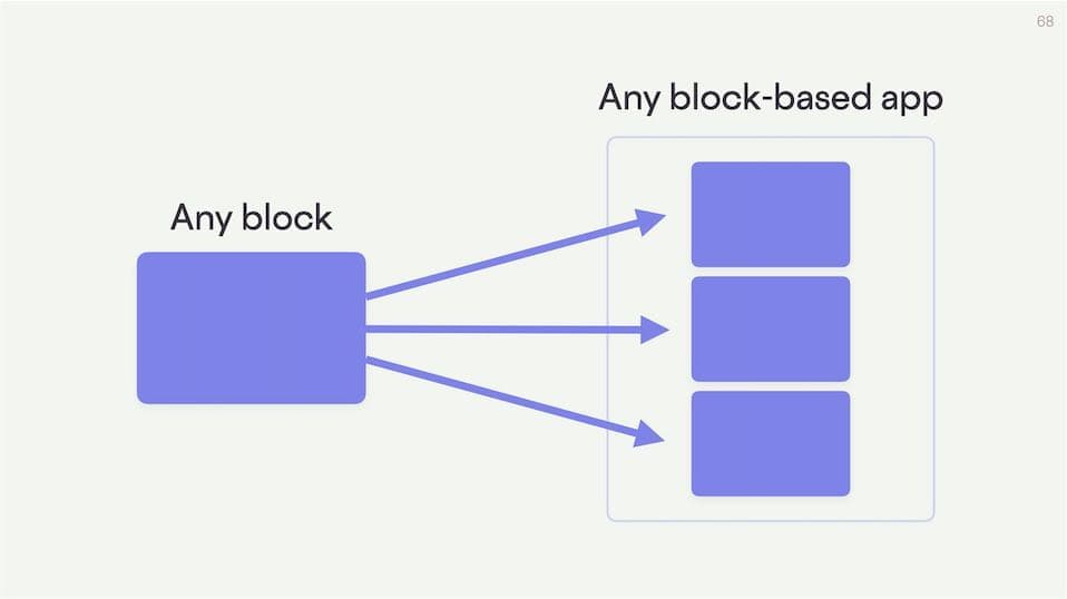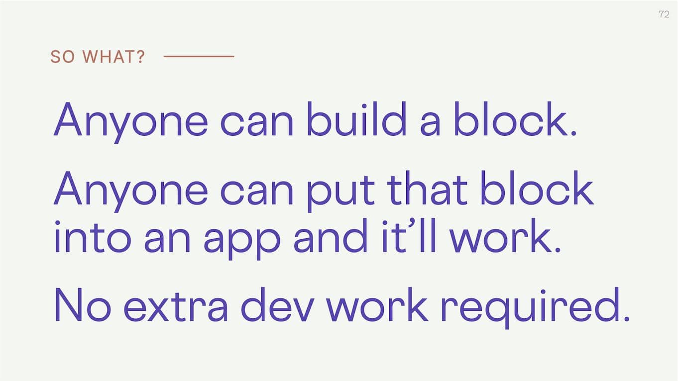 First of all, it means that any independent developer can build a block. Then anyone else can put that block into their application. And it'll work without requiring extra dev work. As long as they both use the protocol.