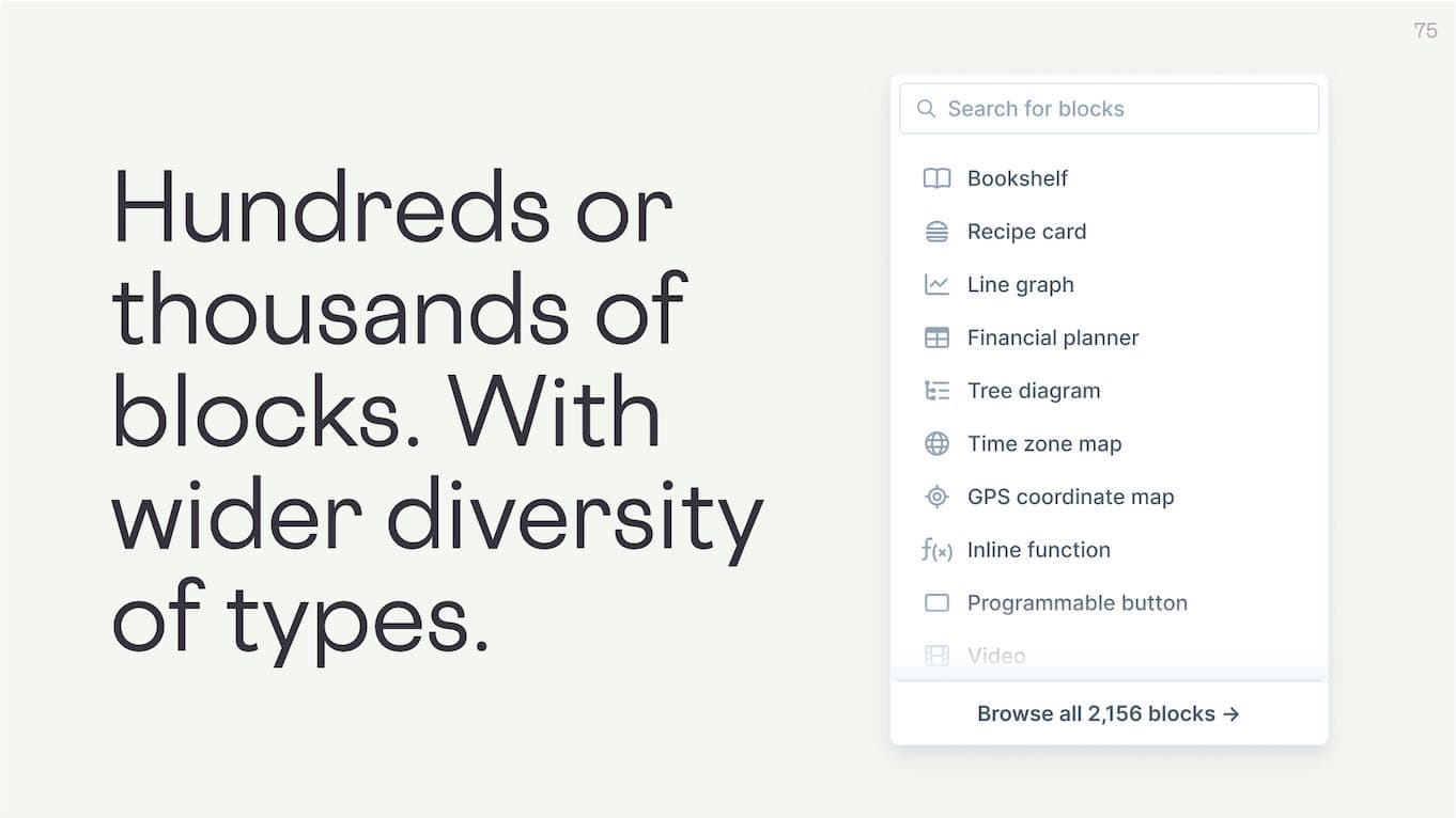 But we would love to make it possible for users to have hundreds or thousands of specialized blocks to pick from. They should have a much wider variety of types avaliable in their apps. People be able to pick from weirder, niche blocks like recipe creators, data visualisation displays, flight path trackers, or financial planners.
