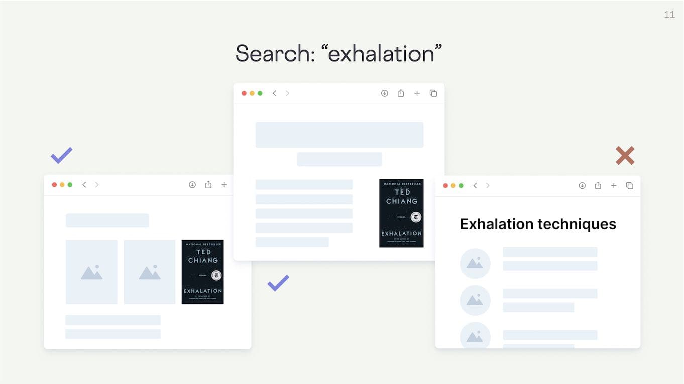 And I do a standard text search for “exhalation”, I'll get some results about the book. But I'm just as likely to get results about breathing techniques or medical issues. The computer doesn't know the difference between Exhalation the book, and exhalation the biological concept. But we can fix this...