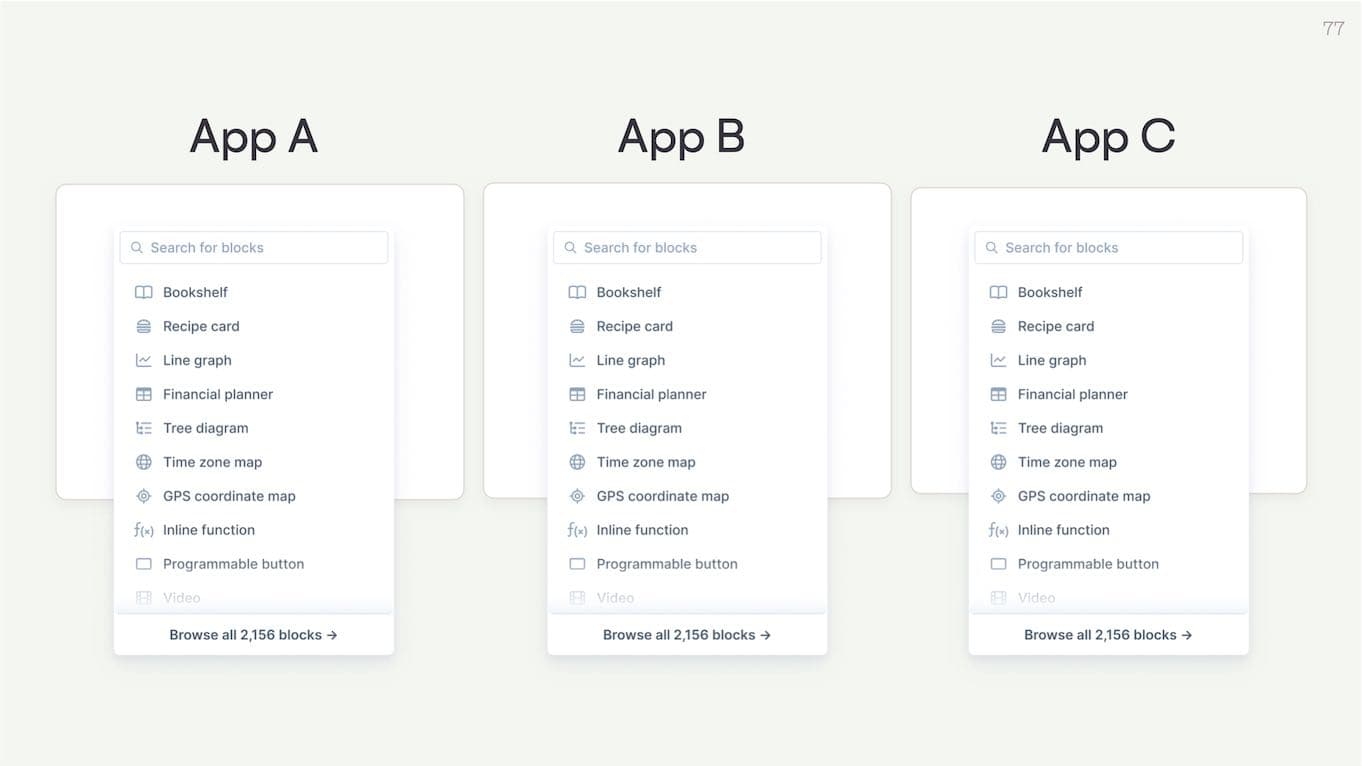 Each app would be able to make this infinite list of block options available. Which saves the developers building those apps from having to make all these block types themselves, or rebuild a table block for the 100th time.