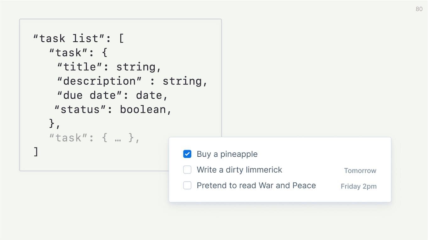 And that Task will have an expected list of properties like a title, description, status, and dueDate. We declare these in a JSON object and valiadate them with JSON schema.