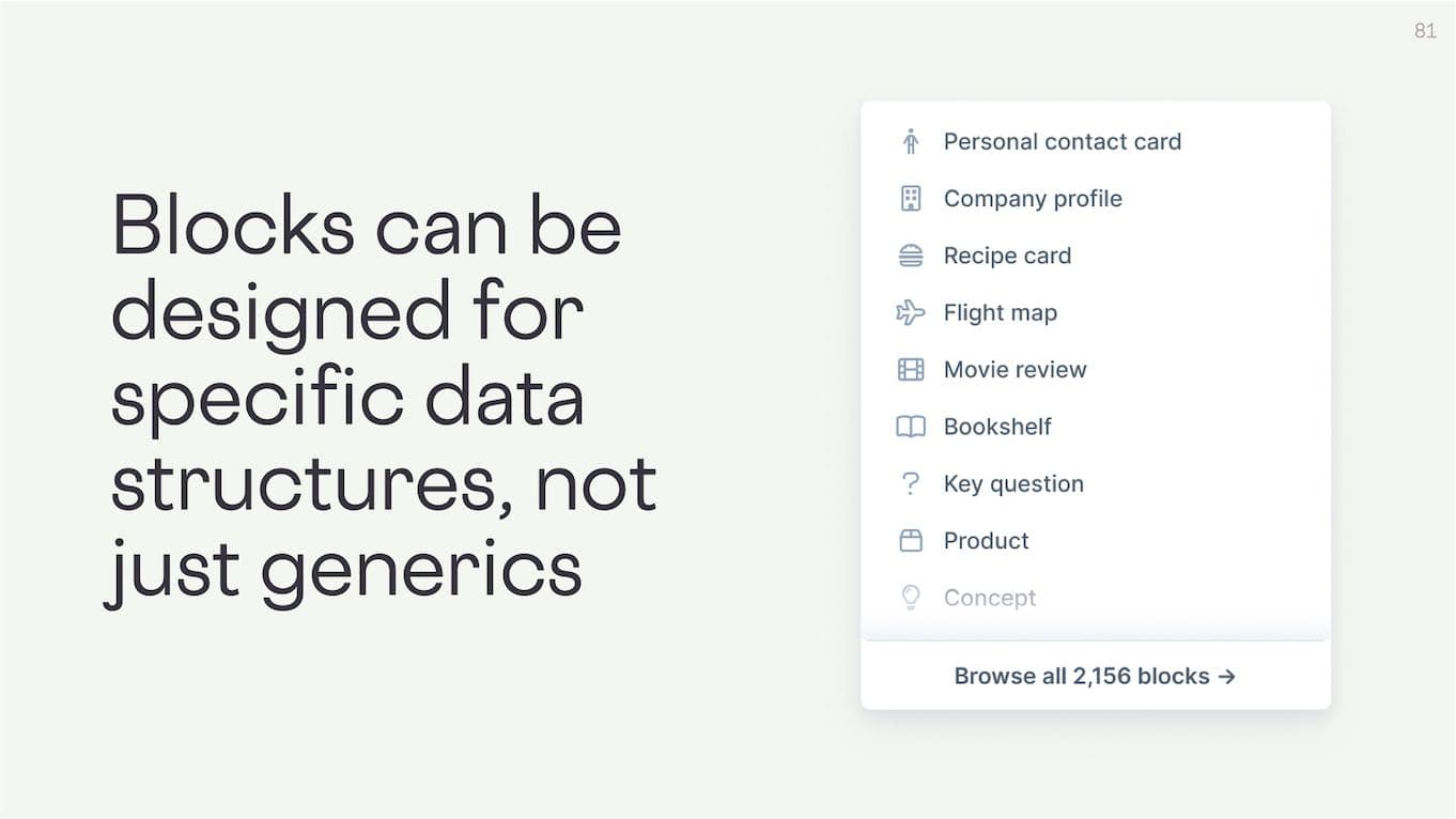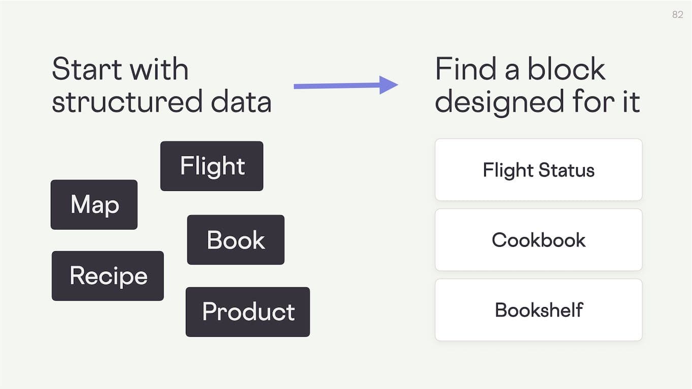 We could have very specialised block types like a Flight Map block that takes in a Flight data structure, or a Movie Review block that takes in a Movie data structure.
