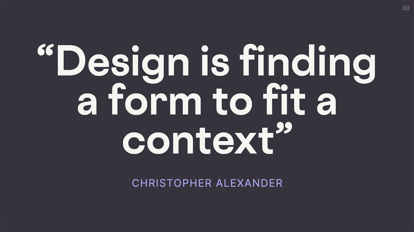 The power of this can best be explained by a quote from the late, great Christopher Alexander: “Design is finding a form to fit a context”