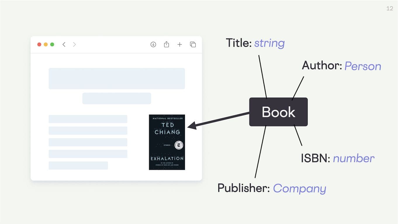 In this case, we would declare the type “book” and declare its properties and their expected types. So we would expect a book to have a title which is going to be a Text string, and an ISBN number, which is going to be a Number.