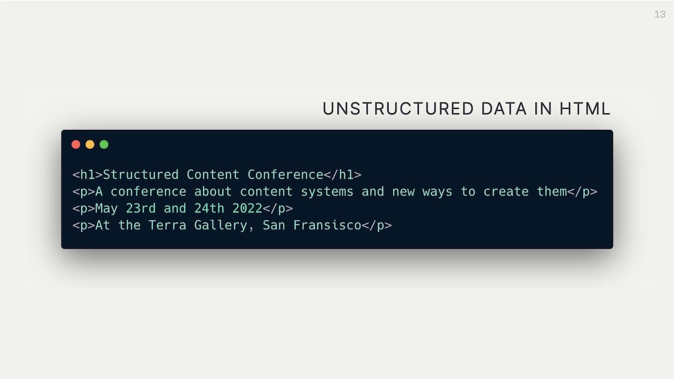 To give you a practical example of what this looks like, this is what unstructured data might look like for a website about this conference. We have the title in an <h1> tag and the description, times, and location in <p> tags.
