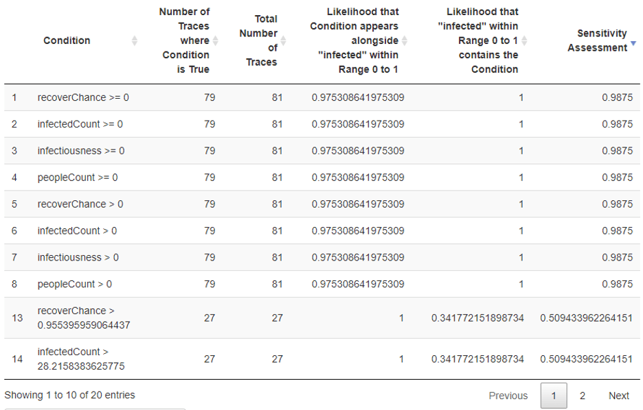 To identify which, if any, of these hypotheses were correct we applied the the Sensitivity Assessor to generate a variety of predicates related to conditions in simulation runs that: (1) are true in runs where zero healthy individuals exist at a certain point in time and (2) are not true in simulation runs where at least one healthy individual exists at a certain point in time. The two predicates with the highest sensitivity assessments were:
