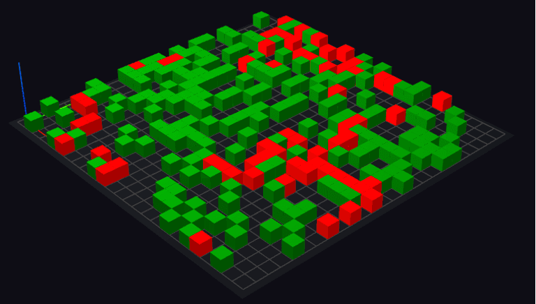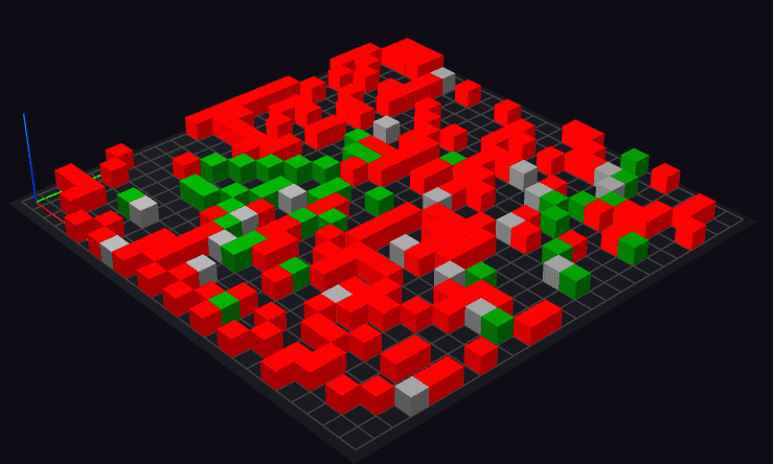 The following figures show the HASH simulation as it progresses. Green squares represent the healthy agents, red squares represent the sick agents, and white squares represent the immune agents. The first screenshot displays the start of the simulation immediately following the initialization of all agents. The second figure shows the simulation after fifteen time steps and the third figure displays the simulation state after thirty time steps.