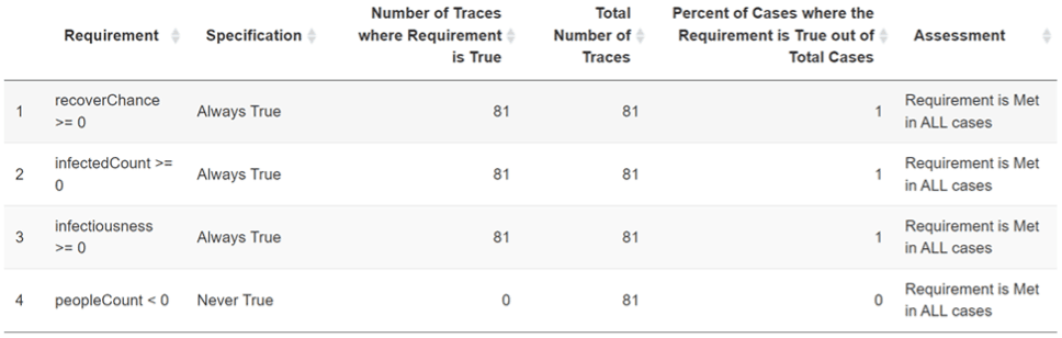 • Assessment: the proper interpretation of the result when accounting for both the Requirement and the Specification. As a result, percentages of both 0s and 1s can be interpreted as successful, when appropriate, and are denoted as “Requirement is Met in ALL cases”.